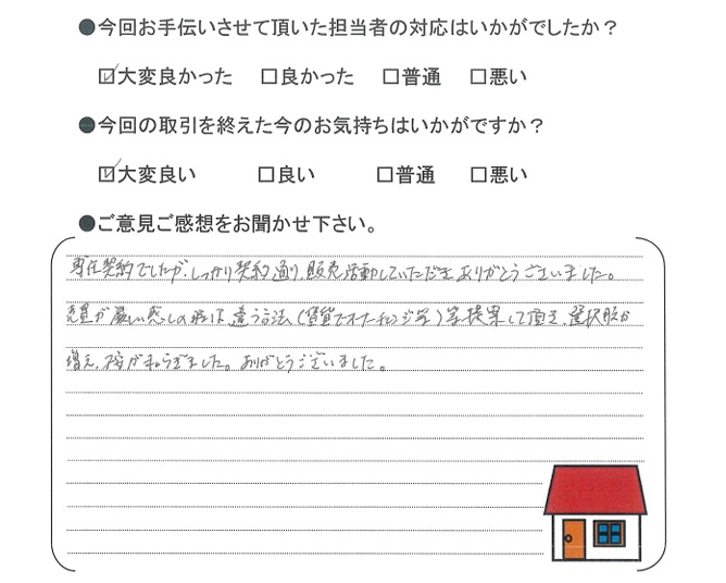 最終売却金額が想定内であったことに感謝しています。都度の対応も迅速に動いて貰い安心感もありました。